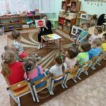Педагог познакомила младших дошкольников с правилами дорожного движения, со светофором, его цветами, что обозначает каждый цвет. Затем, детки поиграли в подвижную игру «Светофор».